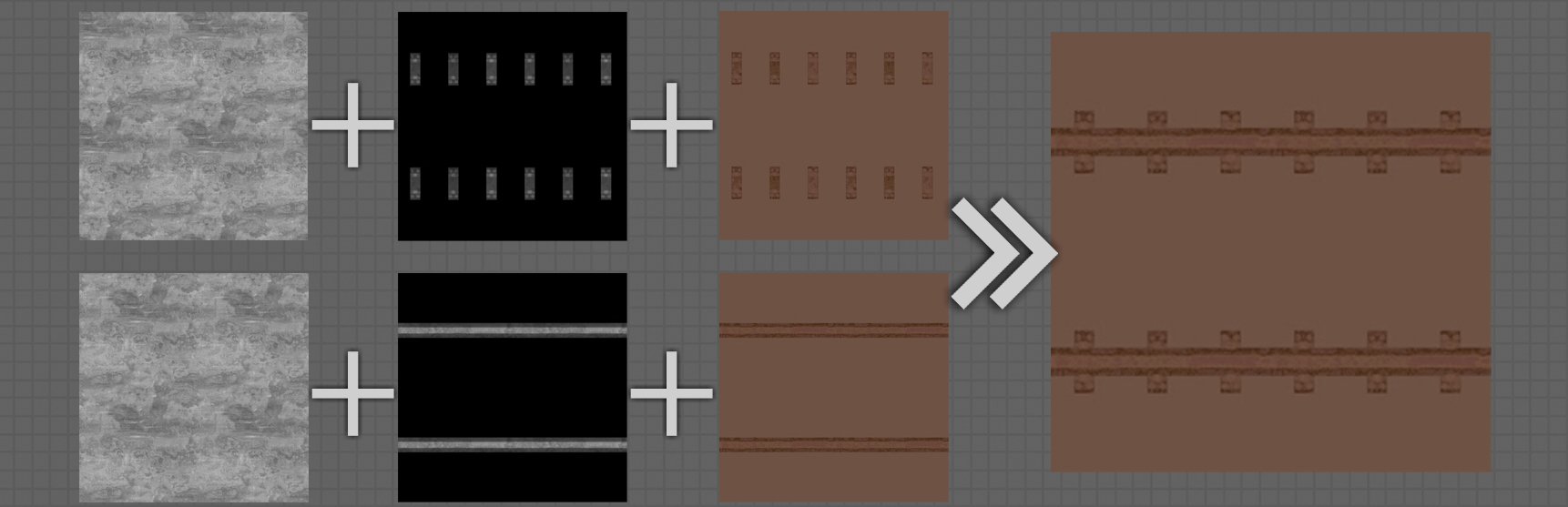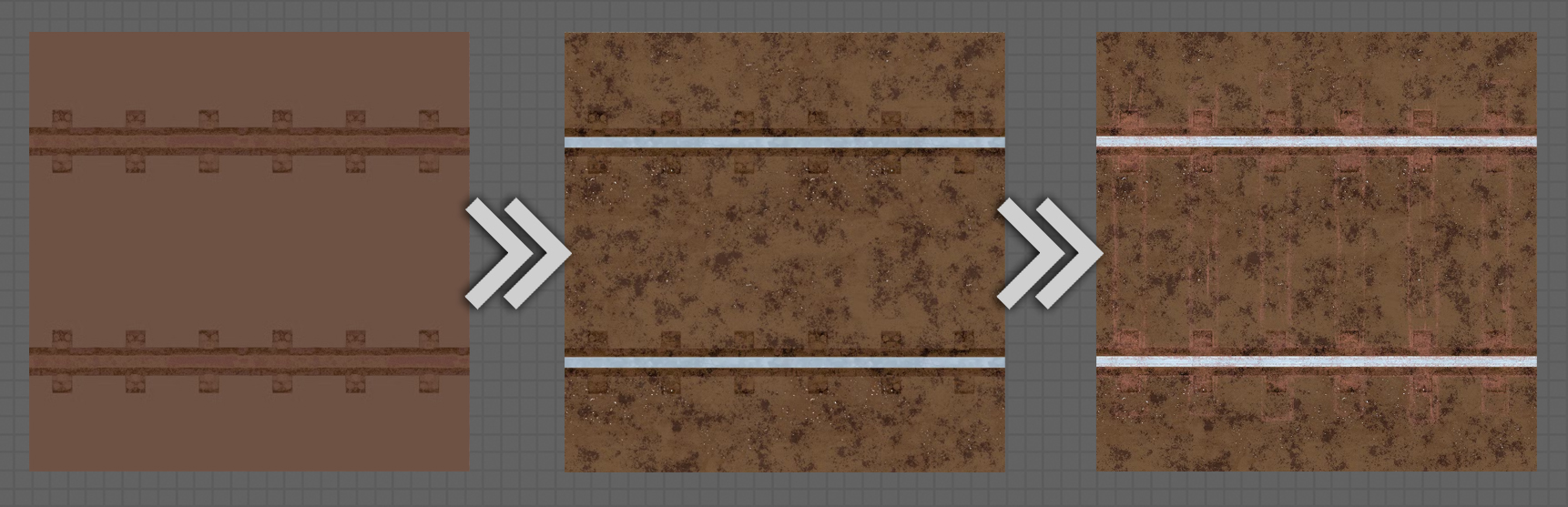 For the rails, the key was capturing the details of rust and wear. The rust variation was mainly achieved using the Grunge Rough Dirty node. In combination with the heightmap of the rails and anchors, processed through a Gradient, this provided a rich initial texture with plenty of color depth.