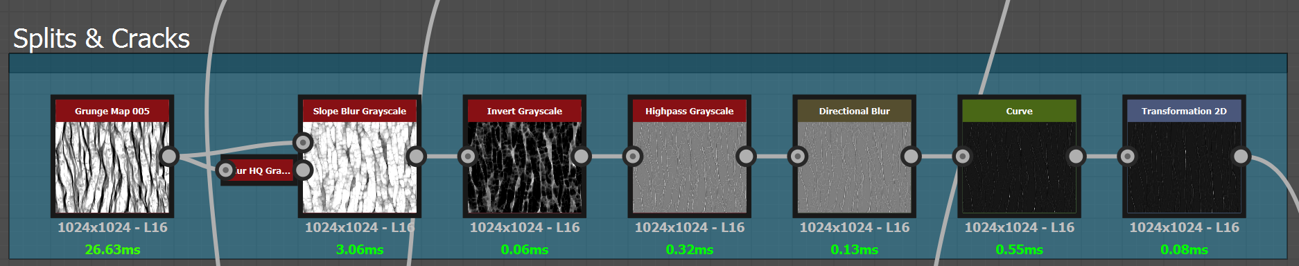 For the wood splits, I utilized the same technique as before, but instead of creating an inflating effect, I achieved a deflating effect by inverting the grunge texture prior to applying the Slope Blur. On another note, the small holes sometimes found in wood—often caused by wood-boring insects—were easy to replicate using just a few strategically placed dots and some subtle Directional Blur.